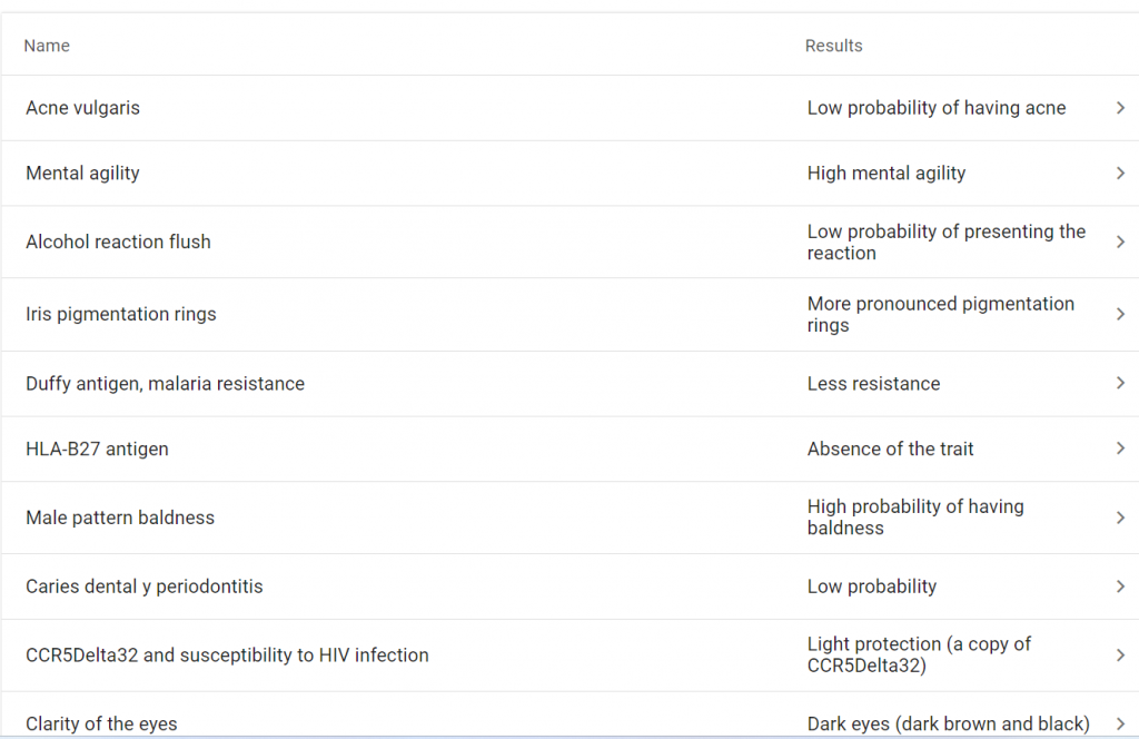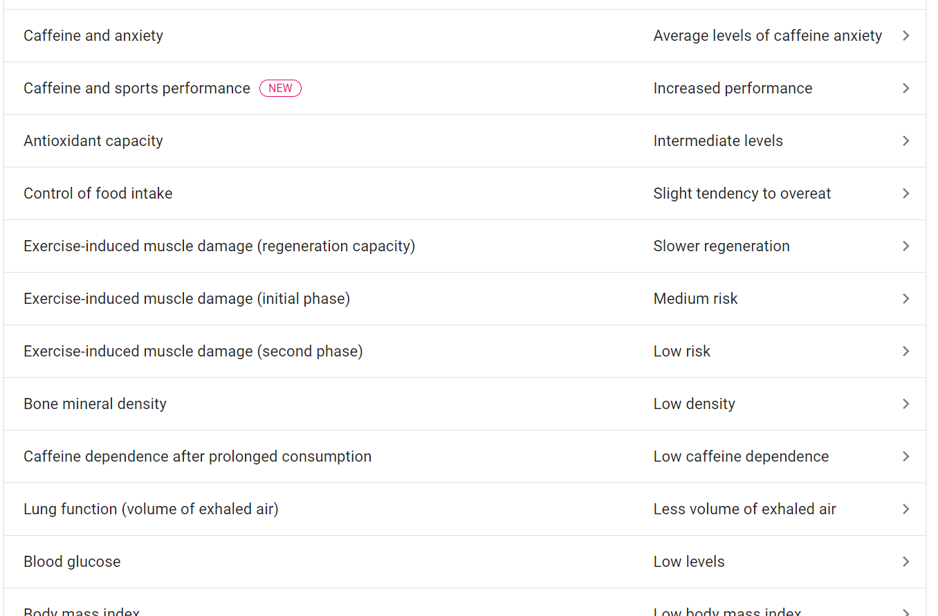 In the following image, you can see a summary of the various wellness aspects analyzed by the test. As with the other sections, you can click on each item to learn more about the findings and how they relate to your overall health and well-being.