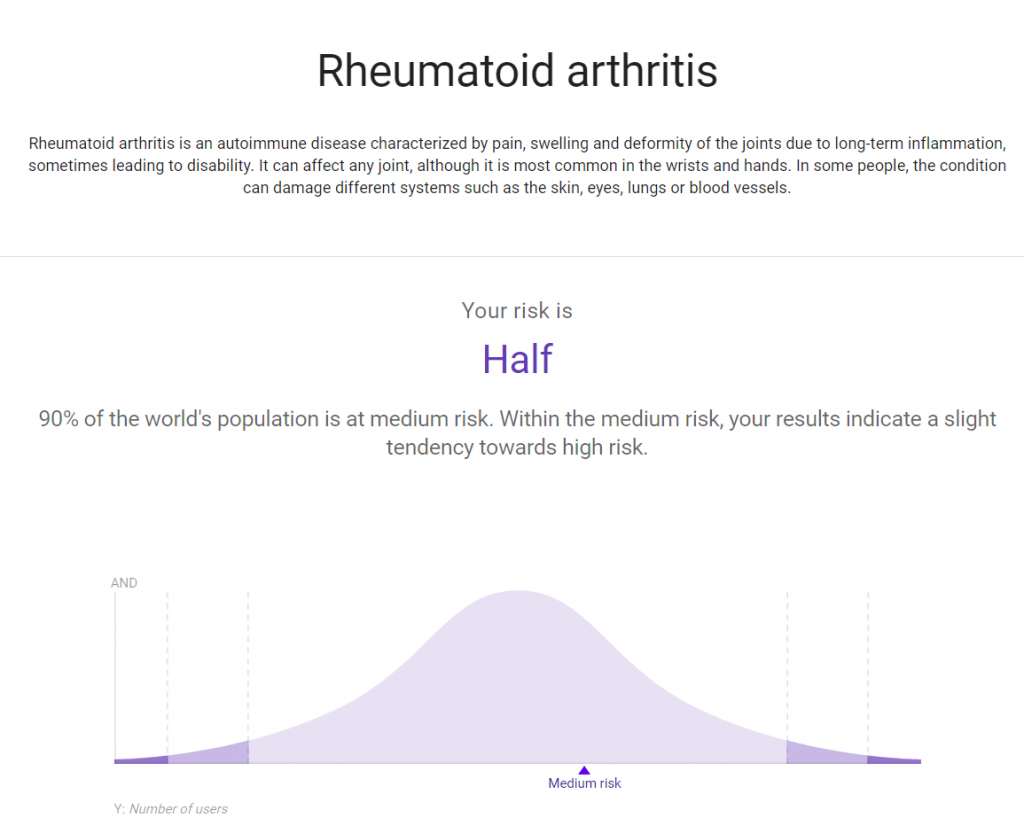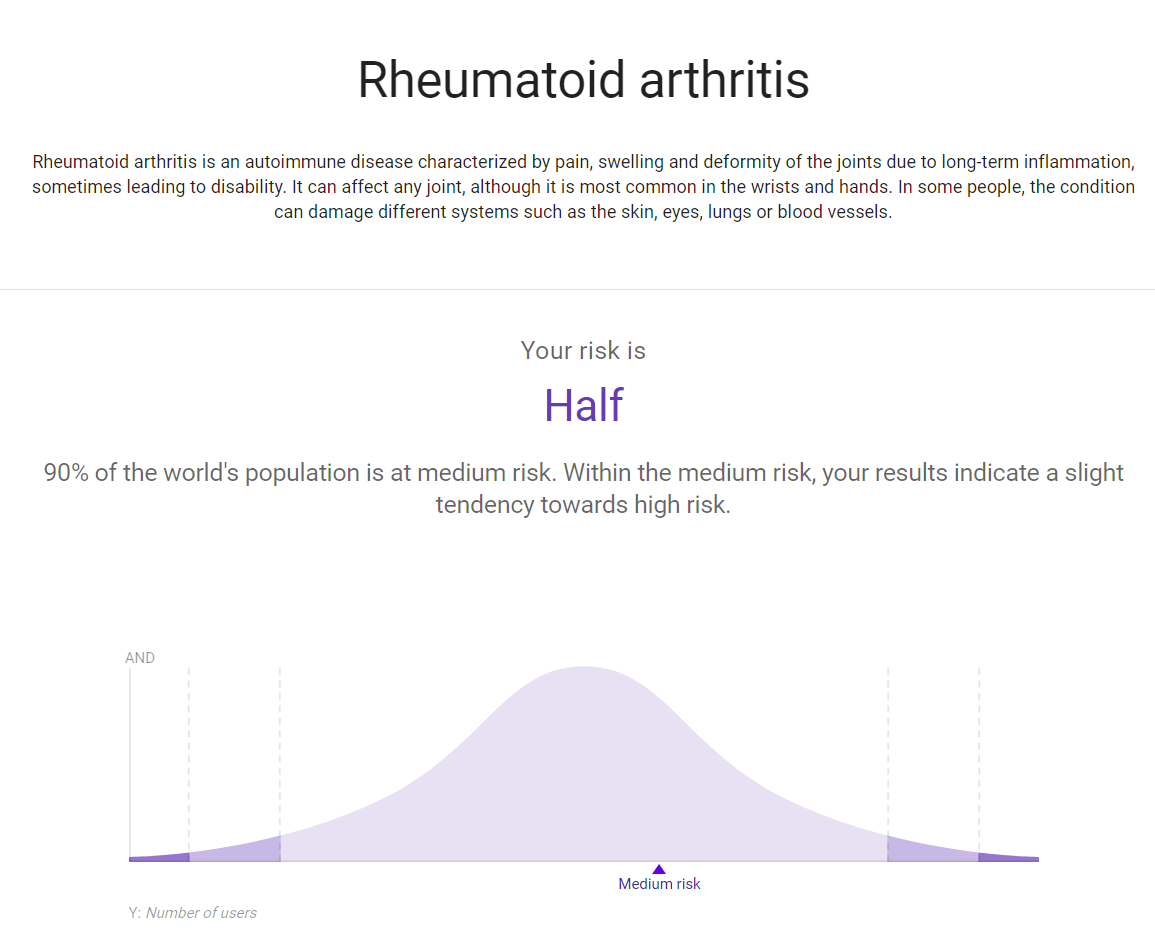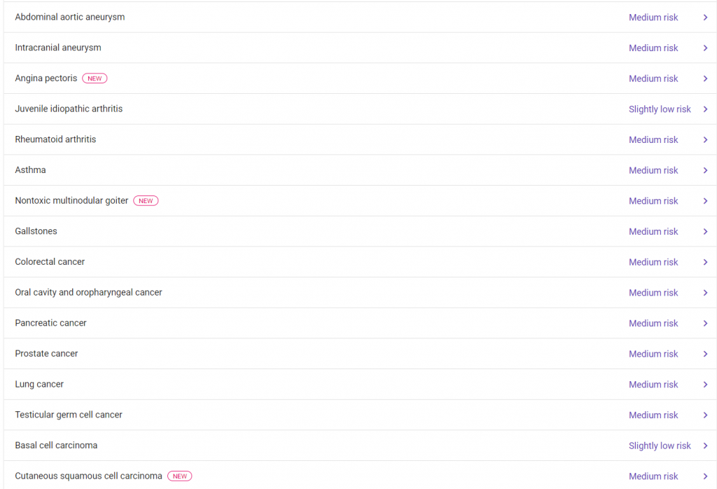 As you can see from the example image, the test screens for a wide range of diseases, offering a risk assessment for each. By clicking on each disease, you can access a detailed summary that includes a visual representation of your risk on a bell curve. However, it’s important not to panic if you see a high-risk score—these are merely predictive data points.