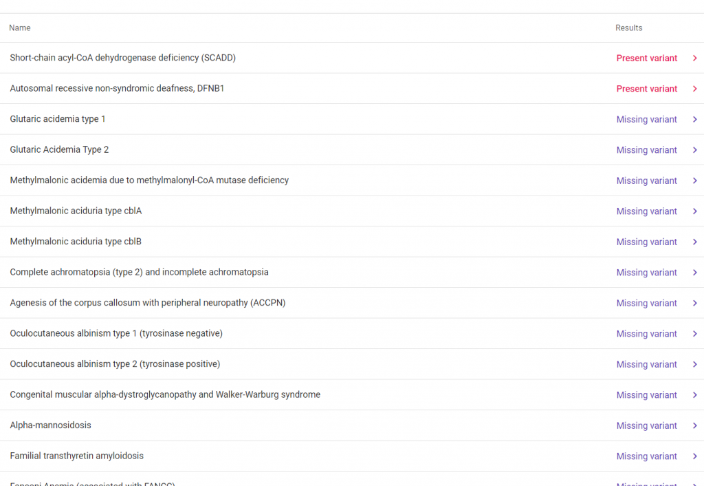 This section focuses on monogenic diseases, which are caused by mutations in a single gene. The report explains that while you may carry a variant for a certain disease, you might only be a carrier if the disease is recessive, meaning you have only one copy of the mutated gene. tellmeGen provides a thorough scientific review for each condition, complete with references for those interested in digging deeper into the science.